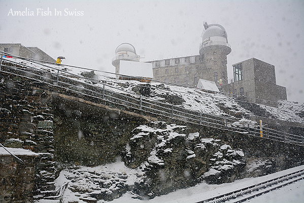 回頭再望一眼3100 Kulmhotel飯店(Gornergrat),風雪太大,火車要停開了,快點下山吧。