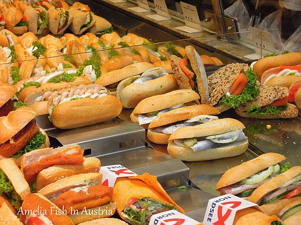奧地利薩爾斯堡,廣場旁小店,這家店三明治種類很多,生意非常好,價格算親民,第一次經過時沒有買,過了半小時再經過它,再也忍不住甜蝦招手,買一個三明治來過癮囉。