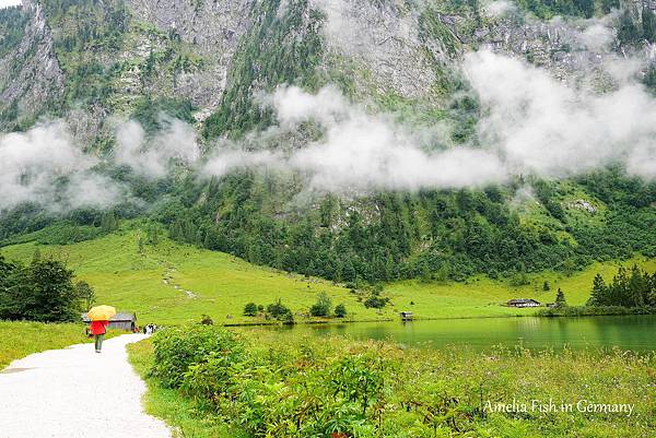 國王湖在德國和奧地利的邊鎮貝希特斯加登(Berchtesgaden),是在冰河時期形成,德國最深的湖,國王湖被阿爾卑斯山脈環繞,因這天下雨,原本應該呈現清澈翡翠綠色的湖水顯得有點濁,本來我很想喝的,國王湖水可能是德國最乾淨的水。步道乾淨舒服,雲霧繚繞像仙境,如果有時間,走一整天都覺不夠。